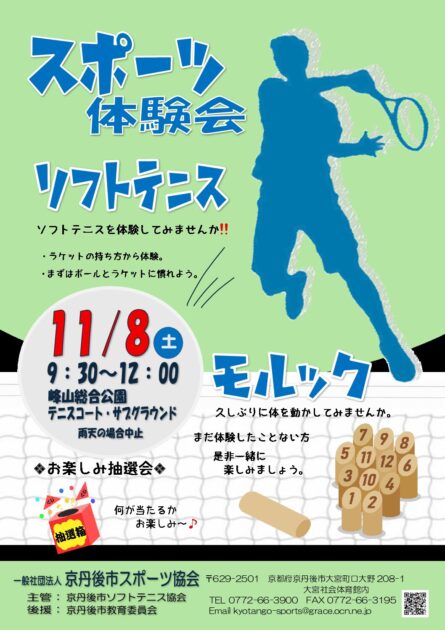 11月8日(土)9時30分より、峰山総合運動公園テニスコートにてソフトテニス体験とモルック体験を開催いたします。