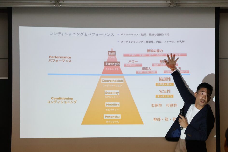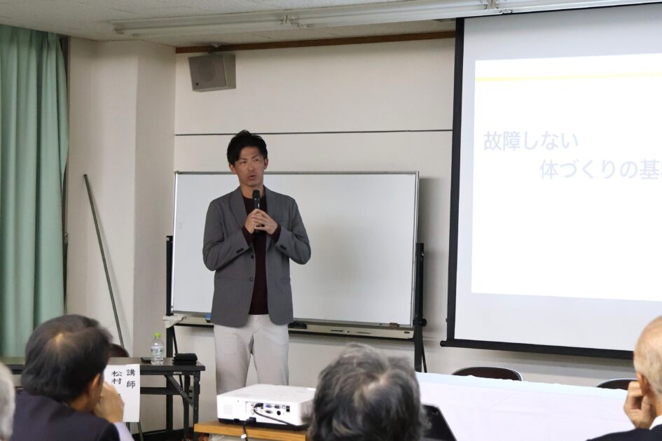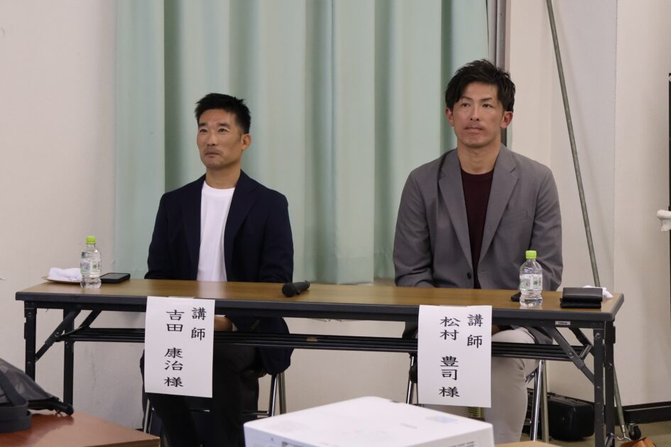 監督自身が選手時代に故障も多く、リハビリ等のトレーニングばかりしていた。今はそのおかげで、故障しないためにはこうすればよいとアドバイスをすることができると話されました。吉田コーチは大学生時代にからチーム初のトレーナーに転身されました。質疑の中で、「私たちが子どもの頃は自然の中で遊ぶ事で、運動神経や体の使い方や、動かし方を身につけたが、最近は遊び方が変わり、股関節を使わなくなり、身体の関節の動きが悪くけがや故障につながっている」と話され、子どもの頃に身体を動かして遊ぶことが大切であることのアドバイスを受けました。