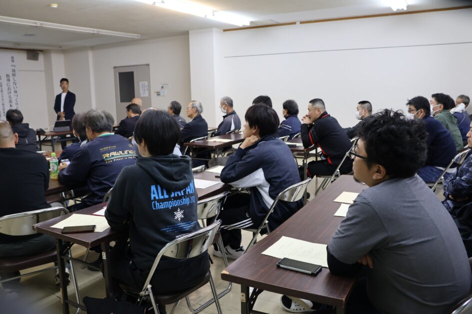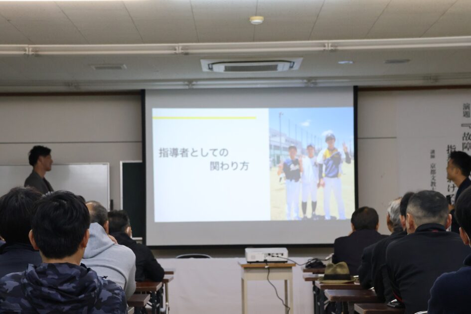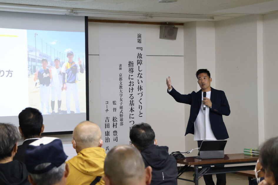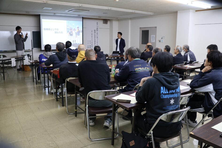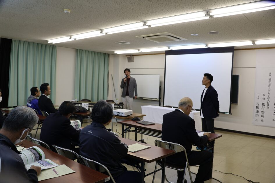 11月15日(土)弥栄地域公民館にて元プロ野球選手で現在は京都文教大学女子硬式野球部の監督を務められている松村豊司氏と、コーチの吉田康治氏を講師にお迎えし指導者研修会を開催しました。