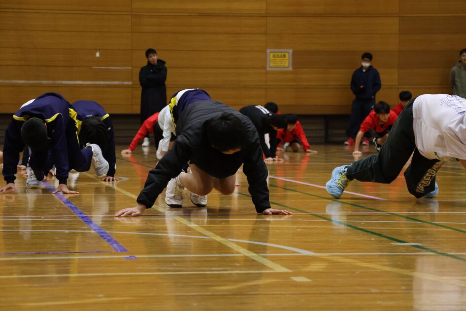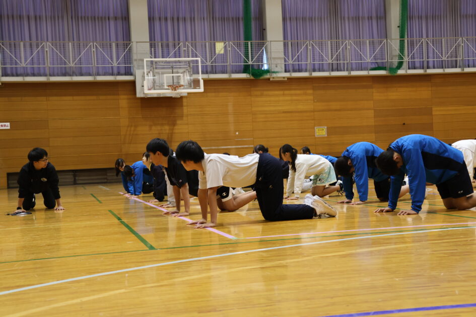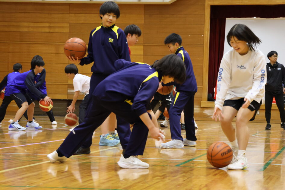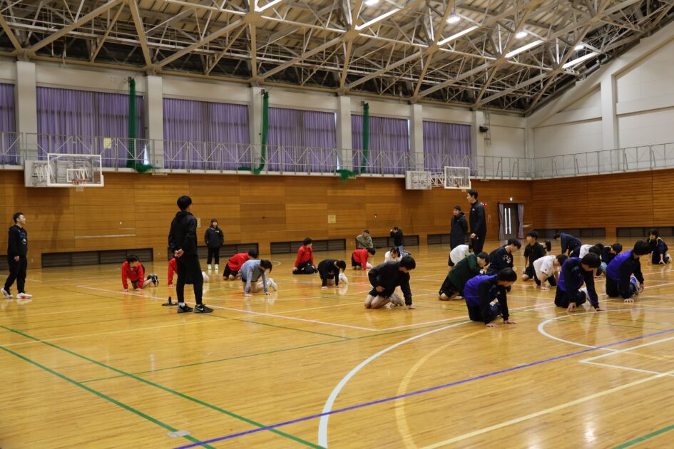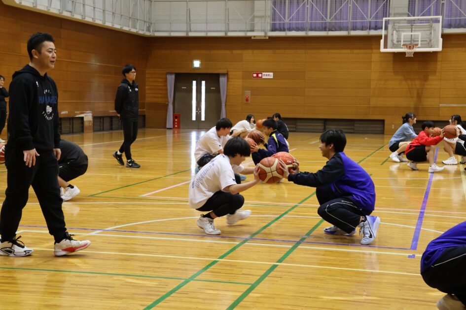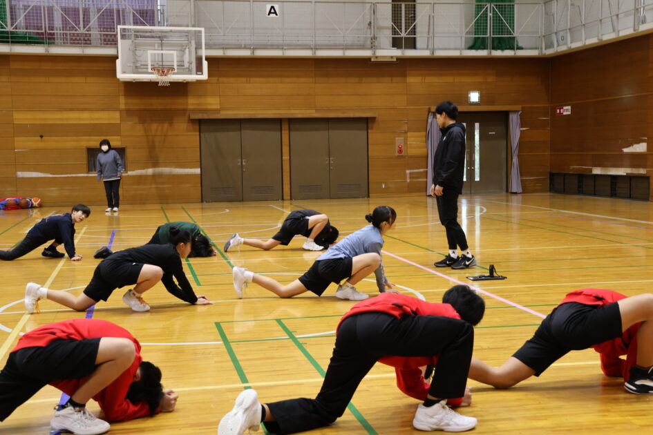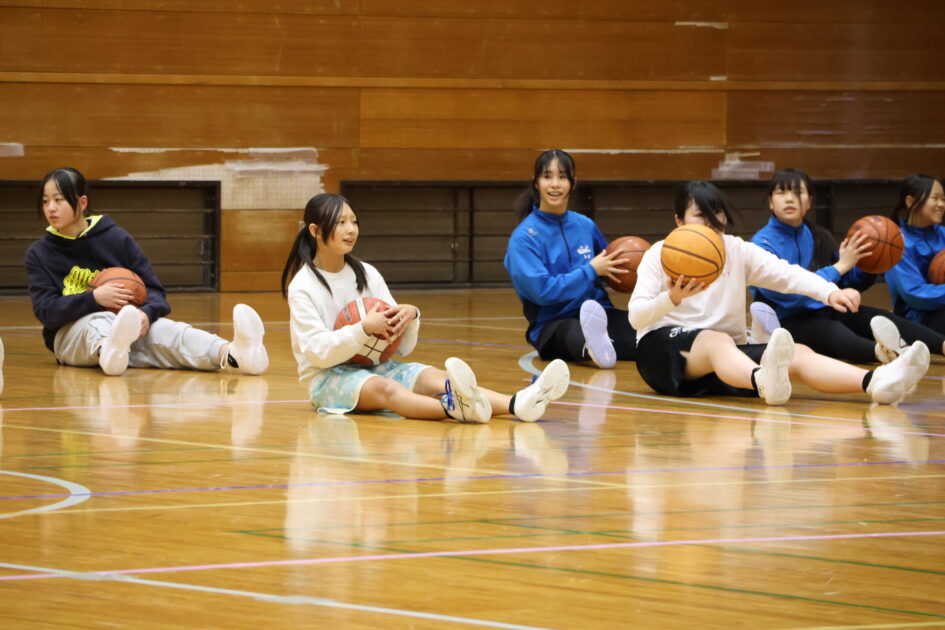 京丹後市内の中学生44人が参加し(参加人数が多いため二部制)身体の柔軟性とバランスやコミュニケーションの大切さをお話ししていただきました。準備運動も身体の隅々まで伸ばす動きで、普段の動きと違い苦戦しながらも上手く動かし、日々の準備運動のスキルを学び、ボールを使ってペアを組みバランスをとりながら運ぶストレッチや、転がしたボールをお尻で止める空間把握認識トレーニングなど、アドバイスをもらいながら笑顔で会話を交わす姿が随所で見られました。練習では、ゴール下のディフェンスやシュート前のオフェンスの動きなどをご指導いただきました。最後に中学生5人対講師3人による試合をしていただき、迫力あるハンドリングを体験できる貴重な時間となったと思います。