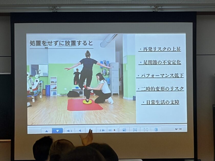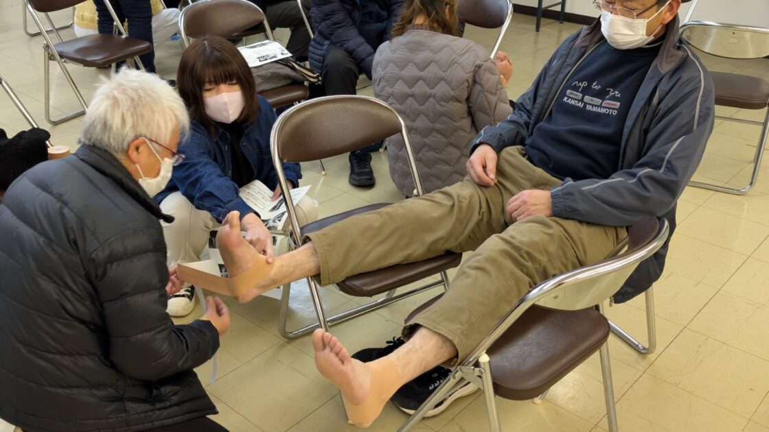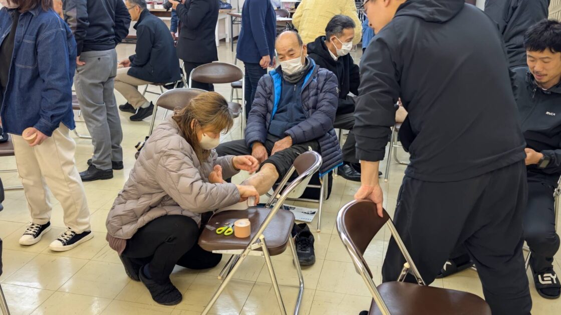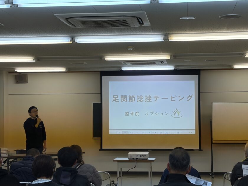 研修会では、「足関節捻挫テーピング」というテーマで、捻挫をしたあとの処置とリハビリがどれだけ重要か!処置をせず放置することで日常生活などで支障がでる!といったお話をしていただきました。実際に参加者の方々に処置の仕方のテーピング巻きを体験していただきました。思っていた以上に難しく四苦八苦されながらも何度も巻きコツを掴みながらしっかり固定する巻き方を習得されていました。